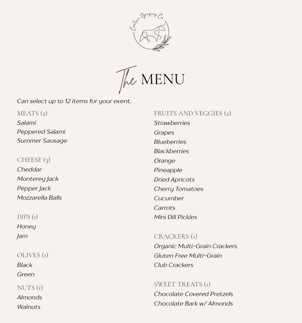 All ingredients, full styling, two hours of bottomless grazing, a customizable 12-item menu, serving boards for your guests, decor to match your event theme, and setup/cleanup.